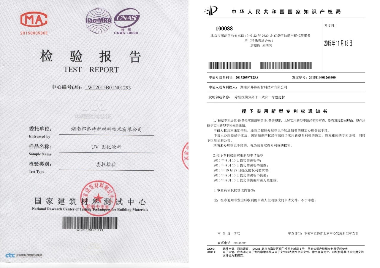 邦弗特UV抗菌涂料專利證書及檢測報告